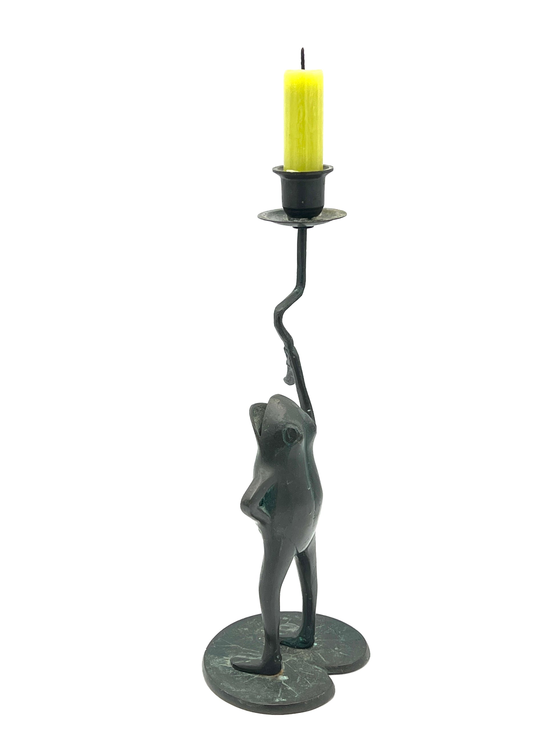 Vintage Green Patina Frog on Lily Pad Candlestick Holder